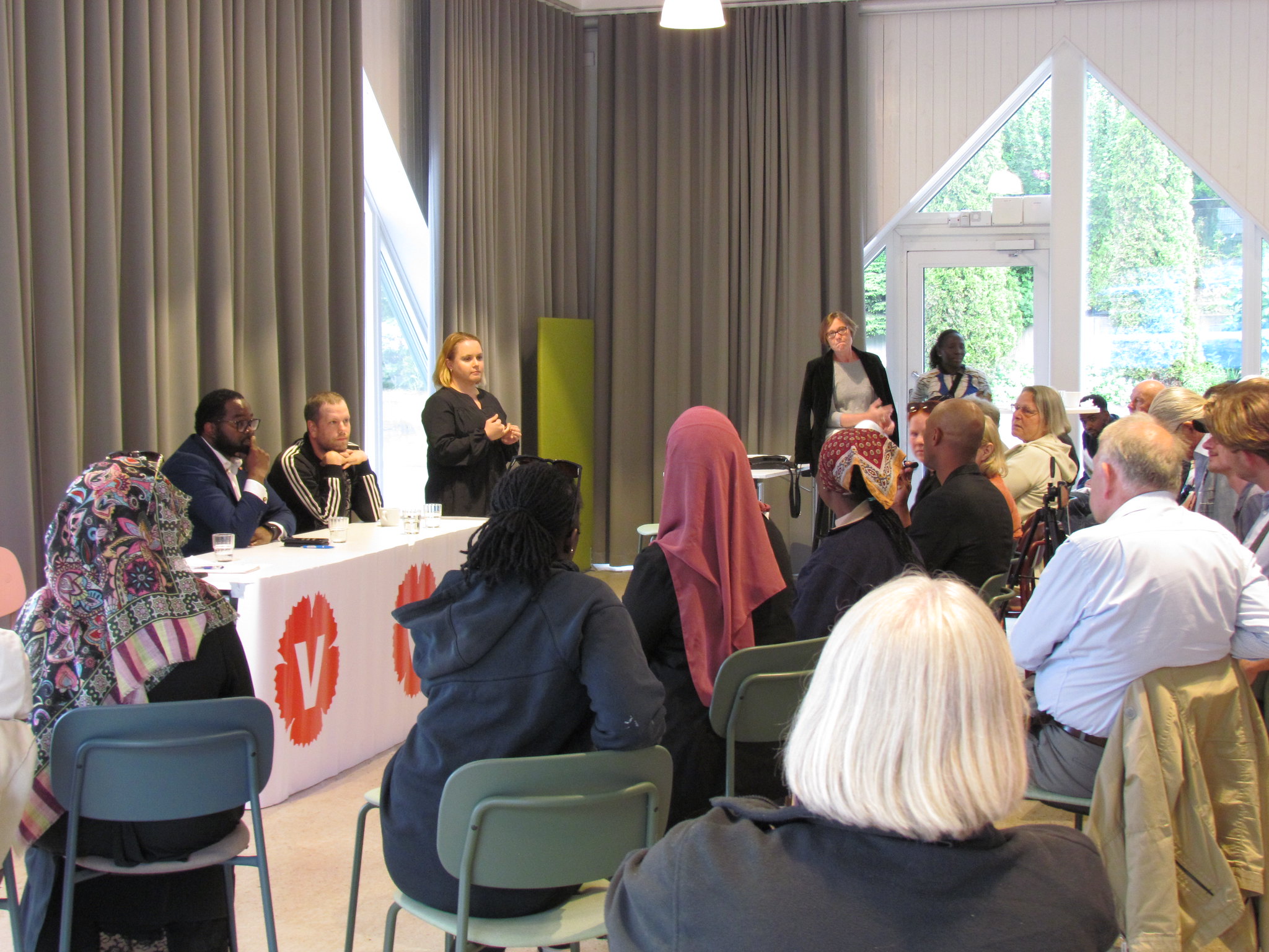 Panelsamtal i Fisksätra Folkets hus – ledda av Alena Jukic (V) – med Fisksätrabor och representanter för lokala föreningar och talespersoner för Vänsterpartiet i panelen.